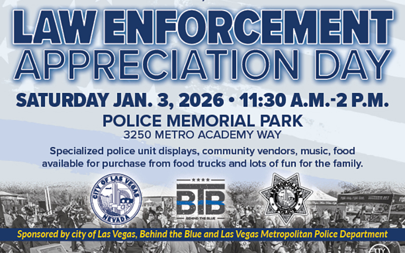 The City of Las Vegas, Behind the Blue, and Las Vegas Metropolitan Police Department are hosting the annual LEAD (Law Enforcement Appreciation Day) event. This free, family-friendly event will include music, food, and lots of vendors.